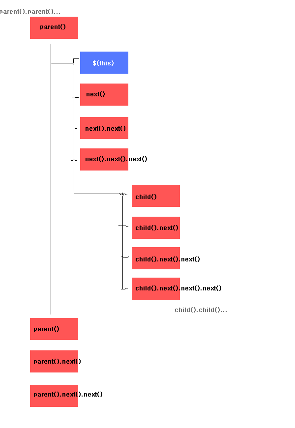 parent().parent().parent().parent().next() 이런식으로 자신의 고조할아버지 동생에게 접근할수 있습니다