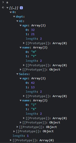 var a = [ {dept:{ 'AI':{name:['H','Y'],age:[32,21]}, 'Sales':{name:['Z','X'],age:[42,13]} }} ]