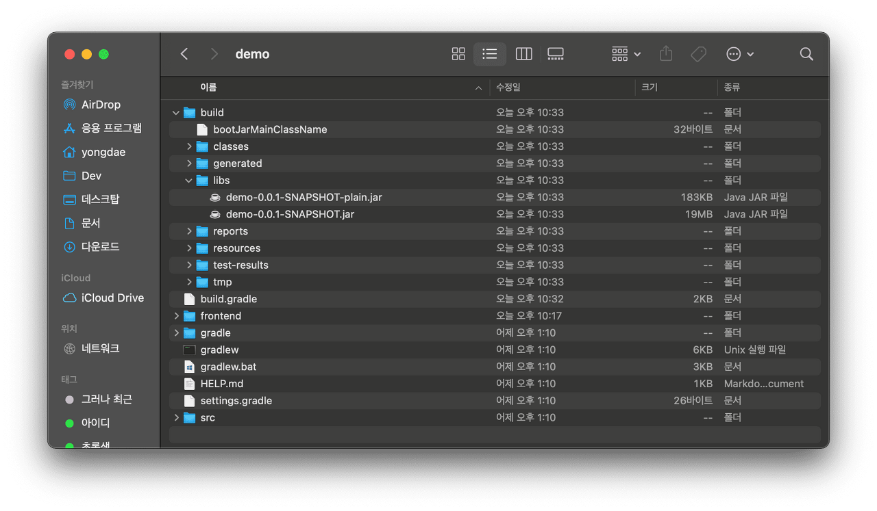 gradle의 build 결과물은 기본적으로 프로젝트 폴더의 buid 폴더에 생성됩니다. SpringBoot 프로젝트의 build 결과물 중 중요한 부분은 build/libs 폴더의 내용입니다. SpringBoot 프로젝트의 경우 배포를 위해 프로젝트를 빌드하면 jar(기본) 파일로 만들어지기 때문입니다.